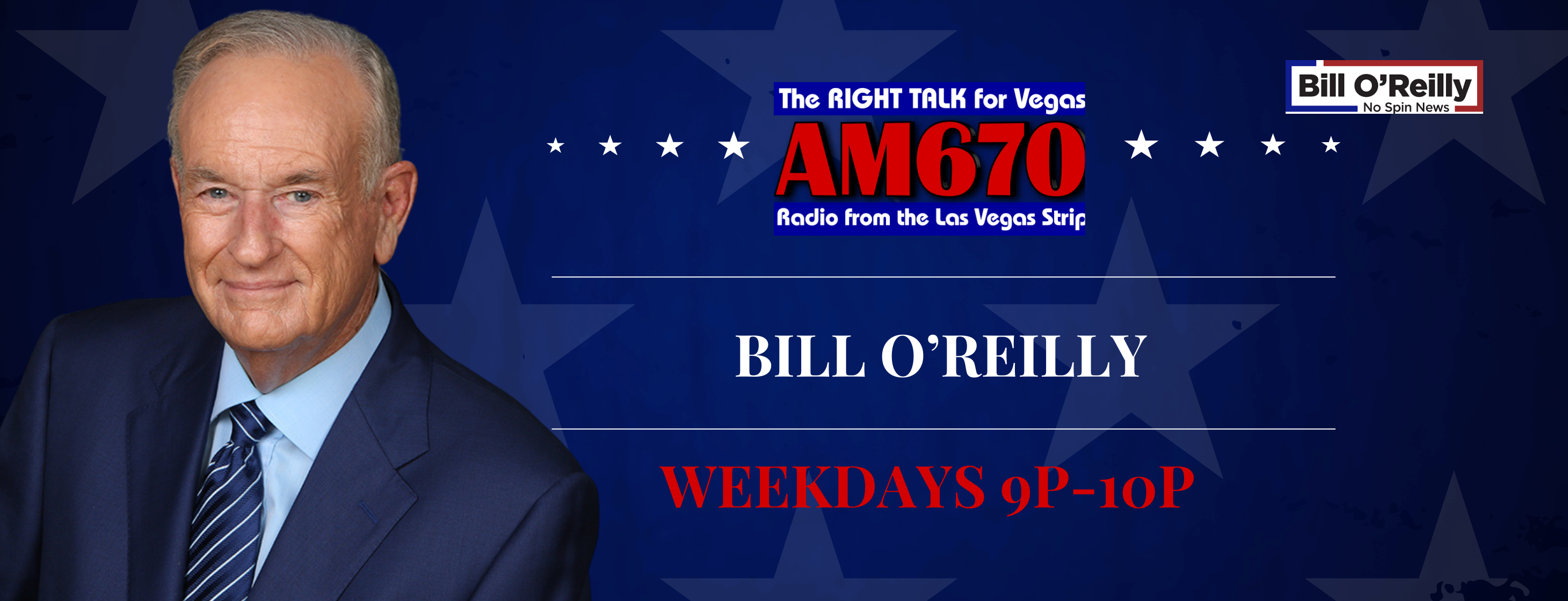 Trailblazing journalist and bestselling author Bill O’Reilly’s one-hour weeknight program, “No Spin News” is now available on AM670 KMZQ. The market-exclusive show brings a full hour of O’Reilly’s fair, smart, fact-based analysis every weeknight, featuring his exclusive commentary, news, and notes on what is happening in the world. “No Spin News” is now available in Las Vegas airing live from the LV Strip, Monday-Friday for weeknight clearance along with the Morning Edition at 6:50 am and News and Comments at 8:45am. The one-hour show has been airing in New York on 77 WABC for over a year under the title “Common Sense with Bill O’Reilly.”